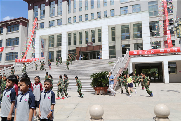 8月28日上午11时30分,常州西藏民族中学校内火灾警报声响起,“请注意!请注意!这里是火警紧急广播,请大家不要慌张,听从指挥,由老师带领按疏散路线撤离。请大家尽量用湿毛巾或者其他东西捂住口鼻,一个接一个尽快从安全通道离开……”活动在急促的消防应急广播声中展开,学校保卫模拟向119报警,一名保安向总指挥报警,指挥商汉勇副校长当即宣布:启动消防应急疏散预案。